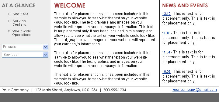 Industrial web design sample 190 allows you to imagine your website in a 3 column design with flash animation to display your company logo and branding. Add important news and announcements to your homepage. Imagine a design similar to this personalized with your images!